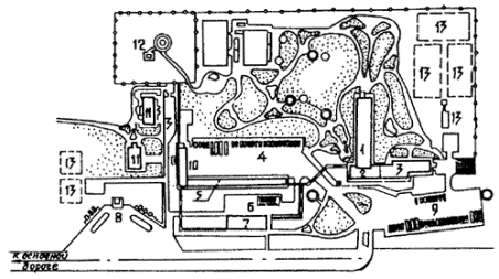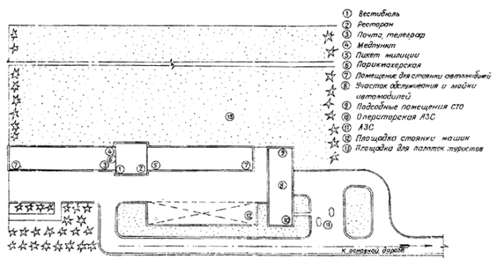 Рис. 6. Транзитный мотель с гостиницей традиционной планировки (типовой проект, Ленинградский филиал Гипроавтотранса). Схема генерального плана. 1. - спальный корпус на 100 мест (2 этажа, 50 номеров), 2 - вестибюль и администрация, 3 - столовая на 100 мест, 4 - внутренняя стоянка автомобилей для проживающих в мотеле, 5 - гараж теплый, 6 - эстакада для осмотра и мойки автомобилей, 7 - станция обслуживания автомобилей 8 - автозаправочная станция, 9 - наружная стоянка для автомобилей посетителей столовой, 10 - котельная, прачечная, 11 - жилые дома персонала, 12 - артскважина, 13 - очистные сооружения сточных вод. Примечание: примыкание подъезда к основной дороге выполняется в соответствии с требованиями СНиП 2.05.02-85