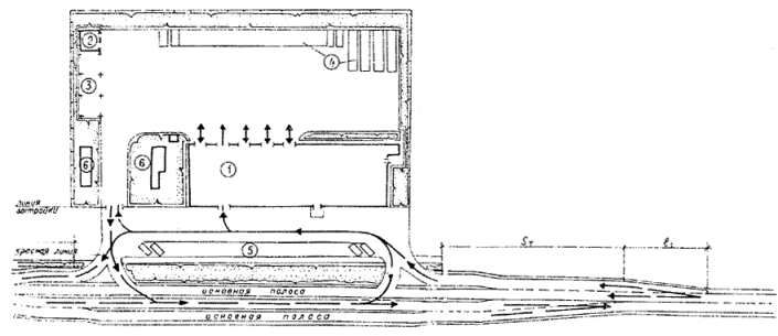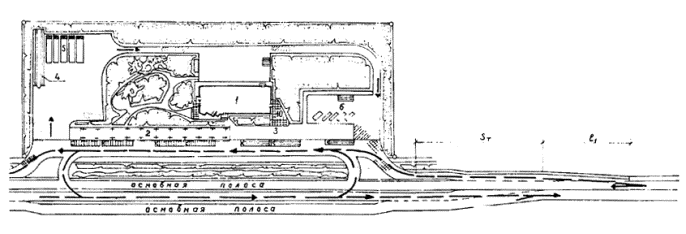 Рис.7. Пассажирская автостанция вместимостью 50 человек (типовой проект, Ленинградский филиал Гипроавтотранса). Схема генерального плана 1 - здание автостанции; 2 - перрон отправления под навесом; 3 - перрон прибытия; 4 - эстакада для осмотра автобусов; 5 - стоянка автобусов между рейсами; 6 - стоянка легковых автомобилей Размеры l1, Sт - определяются по СНиП