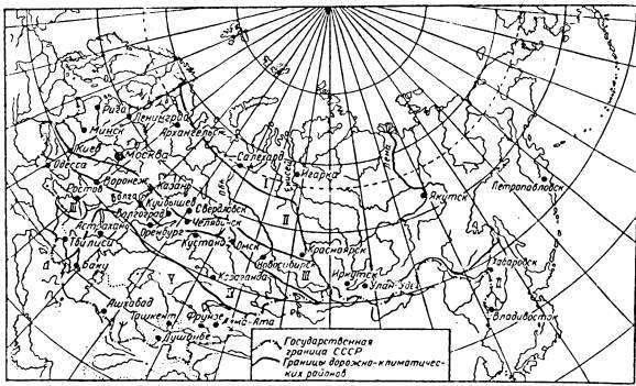 1.3. Конструкцию земляного полотна следует принимать в зависимости от категории дороги, типа дорожной одежды и местных природных условий, в том числе от условий увлажнения, состояния и свойств грунтов основания, с учетом деления территории СССР на дорожно-климатические зоны (табл. 1, рис.1), а также опыта эксплуатации дорог в данном районе и необходимости обеспечения бесперебойного и безопасного движения при оптимальном сочетании строительных и эксплуатационных показателей проектируемых объектов.