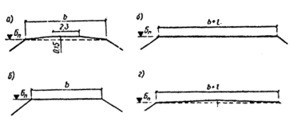 Рис. 2. Поперечное очертание верха земляного полотна: а, г - из глинистых грунтов, мелких недренирующих и пылеватых песков, а также из легковыветривающихся размягчаемых скальных пород соответственно для однопутных и двухпутных железных дорог; б, в - из скальных грунтов слабовыветривающихся и легковыветривающихся неразмягчаемых скальных пород, крупнообломочных и песчаных дренирующих грунтов соответственно для однопутных и двухпутных железных дорог; Бп - отметка бровки земляного полотна по продольному профилю, b - ширина земляного полотна по нормам табл. 15, t - ширина междупутья 3.2. Поперечный профиль верха земляного полотна автомобильных дорог следует проектировать двускатным на прямых участках, а также в пределах кривых радиусом 3000 м и более для дорог I категории и кривых радиусом 2000 м и более для дорог других категорий. В пределах кривых с меньшими радиусами земляное полотно необходимо проектировать односкатным, предусматривая устройство виражей, согласно требованиям главы СНиП по проектированию автомобильных дорог. 3.3. Поперечные уклоны верха земляного полотна автомобильных дорог при двускатном поперечном профиле следует назначать в зависимости от типа применяемого покрытия в соответствии с табл. 14.