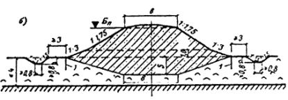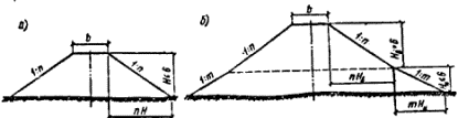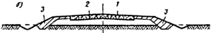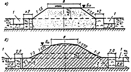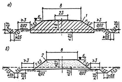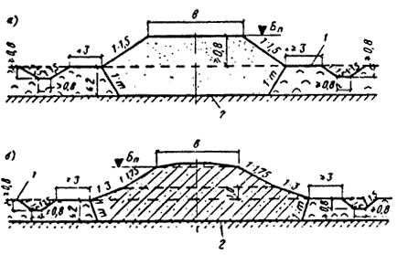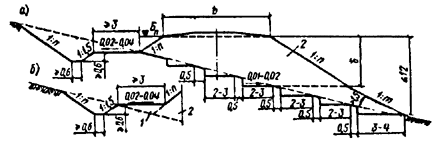 Рис. 3. Поперечные профили насыпей высотой: а - до 6 м для железных дорог; б - более 6 м для железных и автомобильных дорог