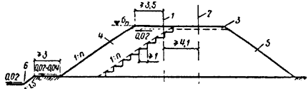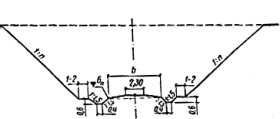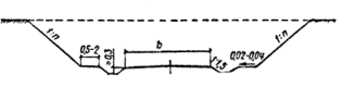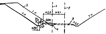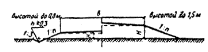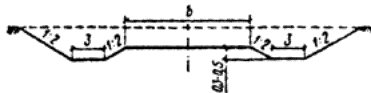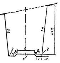 Расстояние между внешней бровкой резерва и границей полосы отвода должно быть не менее 1 м. В районах распространения подвижных песков резервы следует размещать согласно требованиям разд. 9 настоящих Указаний. 11.3. Между подошвой откоса насыпи и бровкой резерва необходимо оставлять берму шириной не менее 3 м для железных дорог и не менее 2 м для автомобильных дорог. У насыпей высотой до 2 м на сухом основании ширину берм разрешается уменьшать до 1 м; автодорожные насыпи высотой до 1,5 м, возводимые из резервов, допускается проектировать без берм (см. рис. 6, а; 7). Со стороны будущего второго пути железных дорог I -III категорий ширину бермы следует назначать равной 7,1 м. Бермам с нагорной стороны необходимо придавать поперечный уклон от 0,02 до 0,04 в сторону резерва за счет срезки или присыпки грунта применительно к рис. 4, а, б. 11.4. Резервы необходимо, как правило, включать в общую систему водоотводных устройств, ограждающих земляное полотно от воздействия поверхностной воды, или предусматривать отдельные выпуски воды из резервов в пониженные места прилегающей местности, согласно требованиям разд. 12 настоящих Указаний. 11.5. Замкнутые резервы без водоотводов допускается применять на участках с дренирующими грунтами в районах с засушливым климатом и в районах распространения подвижных песков. 11.6. Дну резервов, входящих в общую систему водоотводных устройств, необходимо придавать поперечный и продольный уклоны. Поперечный уклон должен быть не менее 0,02, а продольный - не менее 20/00. Дно резерва при его ширине до 10 м следует проектировать односкатным с поперечным уклоном от земляного полотна, а при ширине более 10 м -двускатным, с уклоном от краев резерва к его середине. Наибольший продольный уклон резерва с низовой стороны насыпи не должен превышать 80/00, а для легкоразмываемых грунтов 50/00. Уклон дна резервов с нагорной стороны насыпей следует назначать по расчету в зависимости от вида грунта, количества и скорости течения воды. В случаях, когда по условиям рельефа местности продольный уклон дна резерва получается круче допускаемого по размываемости грунта, резервы следует проектировать отдельными участками с наибольшим допустимым уклоном дна. Между соседними участками резерва необходимо оставлять полосы ненарушенного грунта шириной не менее 3 м, а в местах сопряжения нижнего участка резерва с косогором - не менее 2 м и предусматривать в них устройство канав с перепадами высотой до 0,5 м, согласно требованиям разд. 12 настоящих Указаний. 11.7. Откосы резервов следует проектировать не круче 1:1,5. 11.8. Размеры резервов следует назначать по условиям потребности в грунте, а глубину, кроме того, - с учетом параметров применяемых землеройных машин и требований по устройству продольного водоотвода. При невозможности или нецелесообразности увеличения глубины резерва, используемого в качестве водоотвода, а также в резервах с продольным уклоном менее 50/00 для пропуска воды следует проектировать водоотводную канаву с размещением ее в пониженной части резерва. Поперечные размеры, продольный уклон и тип укрепления канавы следует назначать согласно требованиям разд. 12 и 16 настоящих Указаний. 11.9. На поймах рек закладка резервов допускается в исключительных случаях, причем: расположение резервов необходимо увязывать с регуляционными сооружениями; расстояни