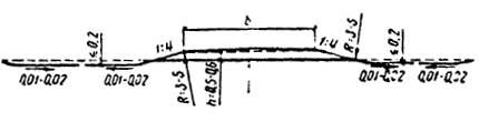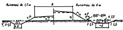 Рис. 7. Поперечный профиль насыпей высотой до 1,5 м для автомобильных дорог в пригородных зонах и в местах, подверженных снежным заносам
