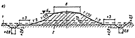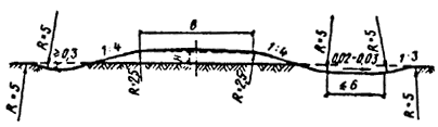 Рис. 34. Поперечный профиль уширенной автодорожной выемки глубиной более 2 м в барханных песках с заросшей поверхностью 10. ЗЕМЛЯНОЕ ПОЛОТНО В РАЙОНАХ ИСКУССТВЕННОГО ОРОШЕНИЯ10.1. На орошаемых территориях земляное полотно следует проектировать с учетом неблагоприятного водного режима, возникающего вследствие: общего повышения уровня грунтовых вод при поливе и промывке грунтов; местного повышения уровня грунтовых вод при размещении дороги рядом с сооружениями оросительной и водосборно-сбросной сетей; затопления резервов, водоотводных нагорных канав и кюветов промывными и поливными водами. 10.2. Проектировать земляное полотно следует с учетом минимального использования площади орошаемых земель. При этом использование ирригационных дамб и сооружений для размещения автомобильных дорог требуется согласовывать с местными организациями, а также с проектно-изыскательской организацией, разработавшей проект ирригационной системы ее развития. 10.3. Земляное полотно дорог, размещаемых на расстоянии менее 60 м от магистральных и распределительных каналов и других сооружений ирригационной сети, необходимо проектировать с учетом рельефа местности, конструкции канала и расхода в нем воды, условий отвода поверхностной воды от дороги, наличия и расположения подъездных дорог к населенным пунктам, необходимости устройства водопропускных сооружений, возможности увеличения высоты насыпи при приближении дороги к каналу, условий эксплуатации дороги и канала, возможности сельскохозяйственного использования земли между каналом и дорогой. 10.4. Расстояние между бровками канала водосборно-сбросной сети и резерва или водоотводной канавы следует принимать не менее 4,5 м; использование кюветов, нагорных и водоотводных канав в качестве распределителей не допускается. 10.5. Расчетный горизонт грунтовых вод следует устанавливать по многолетним данным стационарных гидрогеологических наблюдений в районе проектируемой дороги. При отсутствии таких данных расчетный горизонт грунтовых вод следует устанавливать при инженерно-геологическом обследовании района с учетом сезонных многолетних колебаний уровня грунтовых вод в других районах с аналогичными условиями, а также возможных последующих изменений этого уровня, связанных с освоением и орошением земель. Во всех случаях в качестве расчетного следует принимать наивысший многолетний уровень грунтовых вод. 10.6. На территориях, подлежащих освоению и орошению в период эксплуатации дороги, расчетный горизонт грунтовых вод необходимо принимать по перспективным данным органов водного хозяйства с учетом прогноза изменений естественного уровня грунтовых вод, связанных как с орошением и промывками, так и с дренажными мероприятиями. 10.7. На участках расположения дорог в непосредственной близости от ирригационных сооружений необходимо учитывать, что фильтрационный максимум уровня грунтовых вод возникает в период работы канала с наибольшей нагрузкой. Фильтрационный максимум уровня грунтовых вод следует принимать в качестве расчетного в случаях, когда он будет выше естественного уровня. 10.8. В районах искусственного орошения земляное полотно следует проектировать, как правило, насыпями с использованием поперечных профилей рис. 35. Высоту насыпей необходимо определять с учетом предохранения ве