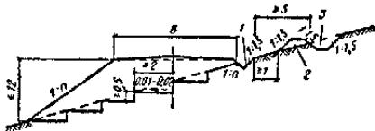 Рис. 9. Поперечный профиль насыпей для автомобильных дорог на косогорах крутизной от 1:5 до 1:3 1 - кювет глубиной не менее 0,3 м; 2 - банкет; 3 - нагорная канава 5.2. Конструкцию насыпей следует принимать в зависимости от высоты насыпи, вида применяемого грунта, поперечного уклона местности и способов производства земляных работ, с использованием поперечных профилей и рис. 3 и 4 для железных дорог и рис. 3, б и 5 - 9 для автомобильных дорог. Водоотводные устройства и резервы следует проектировать в соответствии с положениями разделов 11 и 12 настоящих Указаний. 5.3. Крутизну откосов необходимо назначать по табл. 17 в зависимости от вида грунта и высоты насыпи.