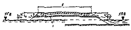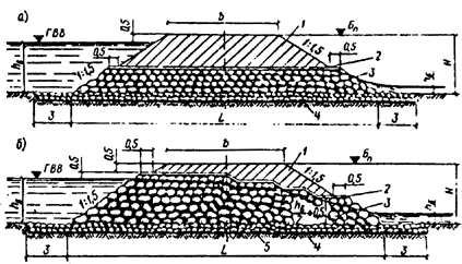 Рис. 40. Продольный разрез фильтрующих насыпей а -напорных; б -безнапорных; 1 -земляное полотно; 2 -изоляционный слой; 3 -ильтрующая часть насыпи; 4 -укрепление основания; 5 -кривая депрессии. ГВВ -расчетный горизонт высоких вод перед сооружением; hв -допускаемая глубина потока перед насыпью; hб-бытовая глубина потока; L -длина фильтрующей насыпи Напорные фильтрующие насыпи, имеющие большую водопропускную способность и требующие меньшего расхода камня по сравнению с безнапорными, целесообразно применять в местах пересечения логов. 17.6. Для фильтрующих насыпей следует предусматривать использование камней примерно одинакового размера, крупностью не менее 0,3 м, морозостойких, неразмягчаемых горных пород (см. приложение 1). В проектах необходимо учитывать, что заполнение пустот между камнями в теле фильтрующих насыпей камнями меньших размеров не допускается. Сверху и с боков фильтрующей части насыпи следует предусматривать устройство изоляции из мха, неразложившегося или слаборазложившегося волокнистого торфа, дерна и других местных материалов толщиной слоя 0,1 м; изоляция укладывается на подготовку из щебня, гравия и камня переменных размеров слоем в 0,3 м. Тело фильтрующей части насыпи должно выступать с обеих сторон земляного полотна в виде берм не менее чем на 0,5 м. Основание фильтрующей насыпи и русло водотока на 3 м в верхнем и нижнем бьефе должны быть укреплены от размыва в соответствии с расчетной скоростью движения воды через насыпь. При этом растительный слой на участках со слаборазмываемыми грунтами удалять не следует. Если верх фильтрующей железнодорожной насыпи располагается на уровне бровки полотна, то над фильтрующей частью и на расстоянии 5 м в обе стороны от нее необходимо предусматривать отсыпку балластного слоя из щебня. 17.7. В проекте производства строительных работ следует предусматривать возведение фильтрующих насыпей способом свободной наброски рваного или скатанного камня, а в случаях применения плитного камня -укладку камней горизонтальными рядами с максимальным оставлением пустот. 17.8. Откосы земляного полотна до верха фильтрующей наброски необходимо укреплять одиночным мощением, бетонными или железобетонными плитами на расстоянии 2 м на входе и выходе от боковой грани фильтрующей насыпи. 17.9. С нагорной стороны фильтрующих насыпей при необходимости следует предусматривать илоудерживающие устройства в виде плетня, вала из камня высотой не менее 0,4 м, фашин и т.д., охватывающие полукольцом на расстоянии около 2 м сходное отверстие. 18. ОСОБЕННОСТИ ПРОЕКТИРОВАНИЯ ЗЕМЛЯНОГО ПОЛОТНА, ВОЗВОДИМОГО В ЗИМНЕЕ ВРЕМЯ18.1. Участки земляного полотна, возводимого в зимнее время, необходимо определять на стадии разработки технического и техно-рабочего проекта и уточнять на стадии разработки рабочих чертежей. 18.2. В проектах необходимо учитывать, что на зимний период целесообразно относить следующие работы: разработку выемок и карьеров в сухих песках, гравийно-галечных и скальных, предварительно разрыхляемых грунтах, а также возведение насыпей из таких грунтов на основаниях, прочностные, и деформативные свойства которых изменяются незначительно в результате их промерзания и оттаивания; разработку в глинистых грунтах выемок глубиной более 3 м с перемещением грунта в кавальер или насыпь; устройство насыпей на болот