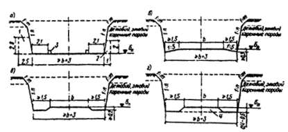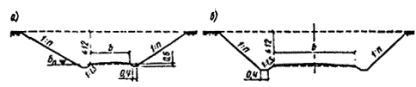 12.6. На водоразделе двух смежных бассейнов, на полосе шириной, не менее 5 м, устройство резервов и канав не допускается, если выпуск, воды будет осуществлен в различные водопропускные сооружения. В необходимых случаях на водоразделе следует предусматривать устройство разделительной дамбы шириной поверху не менее 2 м с заложением откосов не круче 1:2, с возвышением ее верха над расчетным уровнем воды не менее 0,25 м. 12.7. Водоотводные устройства следует размещать в полосе отвода с таким расчетом, чтобы расстояние от наружной бровки откоса водоотводного устройства до границы полосы отвода было не менее 1 м. 12.8. В местах, выхода на склоны водотоков, оврагов и низин водоотводные устройства необходимо отводить и сторону от земляного полотна, предусматривать их укрепление или расширение с соответствующим уположением откосов. 12.9. На участках с наличием грунтовых вод нагорные канавы, а также водоотводные устройства в пределах выемок следует проектировать согласно требованиям разд. 13 настоящих Указаний. Водоотводные канавы 12.10. Продольные водоотводные канавы необходимо предусматривать с нагорной стороны насыпей без резервов. На местности с поперечным уклоном менее 0,02 при высоте насыпей менее 1,5 м, на участках с переменной сторонностью поперечного уклона, а также на болотах водоотводные канавы необходимо проектировать с двух сторон полотна. 12.11. При пересечении местных понижений допускается уменьшать глубину канав до 0,2 м с устройством со стороны насыпи банкета шириной поверху не менее 3 м, с возвышением его бровки над расчетным уровнем воды не менее 0,25 м и поперечным уклоном от насыпи, равным 0,02 -0,04. 12.12. Расстояние между подошвой откосов насыпей и внутренней бровкой продольных водоотводных канав следует принимать для железных дорог не менее 3м, а со стороны размещения будущего второго пути -не менее 7 м; для автомобильных дорог на сырых и мокрых местах это расстояние следует назначать из условия, что между бровкой канавы и кромкой проезжей части должно быть не менее 7 м при насыпях или их основании из супесей и не менее 3 м - из суглинков и глин. Поверхности бермы между насыпью и канавой необходимо придавать поперечный уклон в сторону канавы от 0,02 до 0,04. Водоотводные канавы вдоль насыпей высотой до 0,8 м автомобильных дорог на участках с сухим основанием допускается проектировать треугольной формы без устройства берм (см. рис. 5, а. 12.13. Поперечные канавы следует проектировать в случаях, когда затруднен отвод воды от водопропускных сооружений или продольный отвод воды из местных понижений у земляного полотна. 12.14. Сопряжения водоотводных канав с руслом водотоков следует проектировать с выполнением следующих условий: в месте сопряжения канаву направлять по течению водотока; угол между осями канавы и водотока назначать не более 45°; изменения направления канав проектировать плавными по кривой радиусом не менее 5 м, а на участках подходов к перепадам, быстротокам и искусственным сооружениям - не менее 10 м. Нагорные канавы 12.15. Нагорные канавы необходимо размещать с нагорной стороны выемок с целью перехвата воды, поступающей с косогора и из прилегающего водосборного бассейна и последующего отвода ее к ближайшему водопропускному сооружению или в сторону от земляного полотна. 12.16. На местности с большой крутизной склона, когда продольный укл