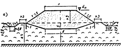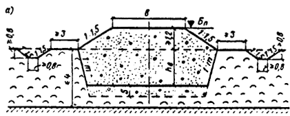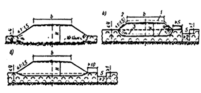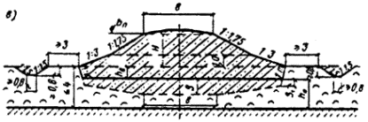 7.8. Для насыпей, проектами которых предусматривается использование торфа в качестве основания земляного полотна, в том числе в случаях применения частичного выторфовывания, необходимо предусматривать статическое и динамическое испытание готового земляного полотна. Насыпи автомобильных дорог 7.9. Требования к грунтам верхней части насыпей на болотах, а также необходимое возвышение низа дорожной одежды определяются указаниями п.п. 5.5 - 5.8 применительно к III типу местности. Нижнюю часть насыпей следует устраивать из дренирующих грунтов. Толщина дренирующего слоя должна быть на 0,5 м больше суммы величин расчетной осадки и глубины выторфовывания. Глинистые грунты допускается использовать для нижней части насыпей при соответствующих технико-экономических обоснованиях. К земляному полотну на болотах, кроме общих требований, изложенных в разделах 1 - 5, предъявляются следующие дополнительные требования: должна быть исключена возможность выдавливания или выпирания болотных отложений из-под насыпи, если это не предусмотрено проектом; интенсивная часть осадки основания (80 - 90 % консолидации) должна завершиться до сооружения покрытия; упругие деформации земляного полотна не должны превышать величину, допустимую для принятого типа покрытия. 7.10. В случаях, когда болотные отложения полностью или частично оставляются в основании насыпи, необходимо определять расчетную величину осадки основания и ее изменение во времени, а также назначать мероприятия, в том числе допустимый режим производства работ по возведению земляного полотна, обеспечивающие ускорение осадки и устойчивость основания. 7.11. Насыпи высотой до 3 м, сооружаемые на болотах I типа глубиной до 4 м, следует проектировать в соответствии с поперечными профилями, приведенными на рис. 29, а, б, в. 7.12. При проектировании насыпей высотой до 3 м на болотах II типа глубиной до 4 м, следует учитывать, что слабые слои болотных отложений будут отжаты в стороны под нагрузкой от веса насыпи (рис. 29, б, в).