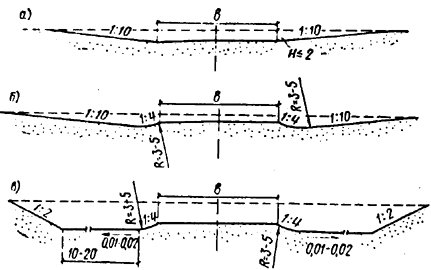 Рис. 33. Поперечные профили выемок для автомобильных дорог в барханных песках а - глубиной до 2 м; б - то же, раскрытых; в - глубиной более 2 м В районах, где по опыту эксплуатации существующих автомобильных дорог в песчаных выемках необходим водоотвод, выемки следует проектировать разделанными под насыпь высотой 0,3 - 0,4 м и с откосами не круче 1:4 (рис. 33, б). Выемки глубиной более 2 м для железных дорог следует проектировать с применением поперечных профилей по рис. 15 и 18. Поперечный профиль рис. 15 разрешается применять в районах с засушливым климатом, если будет обеспечено впитывание и испарение атмосферных осадков в любое время года; крутизну откосов необходимо назначать в зависимости от силы и направления ветра, крупности песка, по не круче 1:2. Выемки для автомобильных дорог необходимо проектировать разделанными под насыпь высотой 0,3 - 0,4 м (рис. 33, в); расстояние между подошвой насыпи и откосом выемки следует принимать шириной 10 - 20 м в зависимости от силы ветра, его направления и крупности песка. 9.3. На участках с полузаросшей и заросшей поверхностью земляное полотно следует проектировать с расчетом максимального сохранения растительности и естественного рельефа прилегающей местности. При этом насыпи для автомобильных дорог необходимо проектировать минимальной высоты без резервов; возведение насыпей следует предусматривать с применением продольной возки и использованием грунта из выемок или из карьера, закладываемых с подветренной стороны на расстоянии не менее 50 м от проектируемой дороги. Насыпи для железных дорог следует проектировать с узкими и глубокими резервами, а крутизну откосов насыпи принимать по табл. 17. Выемки для железных дорог следует проектировать с применением поперечных профилей по рис. 15 и 18. Крутизну откосов выемок разрешается принимать соответственно углу естественного откоса песка в данном массиве, но не круче 1:1,5. Выемки глубиной до 2 м проектировать раскрытыми не требуется. Выемки для автомобильных дорог необходимо проектировать минимальной ширины с откосами 1:2. Выемки, грунт из которых будет использован для возведения насыпей, следует проектировать в соответствии с поперечным профилем рис. 34.