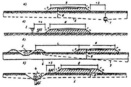 Рис. 35. Поперечные профили насыпей вблизи ирригационных сооружений а - насыпь, размещаемая вдоль закрытых трубчатых дрен или коллекторов; б - то же, вдоль каналов из железобетонных лотков, в -то же, вдоль каналов за пределами влияния фильтрационного максимума уровня грунтовых вод (УГВ); г -то же, вдоль открытых коллекторов; 1 -трубчатая дрена или коллектор; 2 -лоток; 3 -расчетный уровень воды в канале; 4 -коллектор; 5 -УГВ, пониженный дреной или коллектором; 6 -естественный максимум УГВ; 7 -фильтрационный максимум УГВ; 8 -расчетное возвышение низа дорожной одежды над УГВ; L -расстояние, назначаемое по расчету 11. РЕЗЕРВЫ, КАВАЛЬЕРЫ, БАНКЕТЫРезервы 11.1. Резервы, размещаемые вдоль насыпей или сосредоточенные резервы - грунтовые карьеры, располагаемые в удалении от насыпи, следует проектировать в случаях непригодности для насыпи грунта из смежных выемок или нецелесообразности его транспортирования. Вдоль насыпей не допускается размещать резервы в случаях, когда невозможно отвести воду из них, а так же при проектировании автомобильных дорог с сохранением ландшафта окружающей местности. Не допускается размещать резервы в пределах раздельных железнодорожных пунктов и населенных мест, в местах расположения путевых зданий и переездов, на участках развития карста, а также, как правило, на поймах рек. Смежные резервы у отдельных зданий и переездов следует соединять водопропускными канавами, лотками или трубами. Размеры и конфигурация грунтовых карьеров назначаются с учетом потребности в грунте и в соответствии с требованиями техники безопасности. 11.2. Расположение резервов относительно проектируемой насыпи следует назначать согласно табл. 30 с учетом местных условий, влияющих на конструкцию и технологию сооружения земляного полотна. Таблица 30
