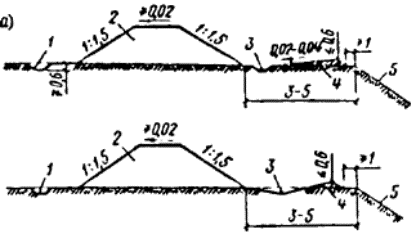 Рис. 36. Схема размещения кавальеров и водоотводных устройств а - с трапецеидальной забанкетной канавой; б -с треугольной забанкетной канавой, 1 -нагорная канава: 2 -кавальер; 3 -забанкетная канава; 4 -банкет; 5 -откос выемки