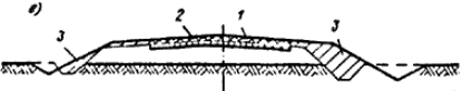 Рис. 38. Поперечный профиль выемки, уширяемой под второй путь 1 - ось второго пути; 2 - ось первого пути; 3 - дренирующий грунт; 4 - кювет в существующей выемке; 5 - проектируемое уширение Необходимость и величина уширения выемок сверх установленных минимальных размеров должна быть обоснована технико-экономическими расчетами с учетом предусмотренных в проекте механизированных средств и способов производства работ, а также местных природных условий. 14.16. Поперечный профиль выемки со стороны второго пути следует проектировать с учетом вида грунта согласно требованиям разд. 6 настоящих Указаний, а крутизну откоса назначать по нормам табл. 21, но не круче устойчивых откосов существующей выемки. 14.17. Верху земляного полотна под второй путь необходимо придавать поперечный уклон 0,04 в сторону проектируемого кювета. При этом требуется предусматривать засыпку существующего кювета со стороны второго пути грунтом, однородным с грунтом в пределах основной площадки проектируемого полотна, и его уплотнение согласно требованиям разд. 2 настоящих Указаний. 14.18. Скальные выемки следует проектировать с расчетом на применение рыхления грунта методом шпуровых и скважинных зарядов и с использованием экскаваторов. В затяжных выемках допускается предусматривать сдвижку на время производства работ существующего пути с ограждением его от повреждений по согласованию с Министерством путей сообщения. Земляное полотно автомобильных дорог 14.19. При реконструкции автомобильных дорог необходимо предусматривать максимально возможное использование существующего земляного полотна применительно к поперечным профилям рис. 39. 14.20. Уширение земляного полотна следует, как правило, предусматривать с одной стороны (см. рис. 39, в); двустороннее уширение допускается (см. рис. 39, а, б) в случаях необходимости или экономической целесообразности.