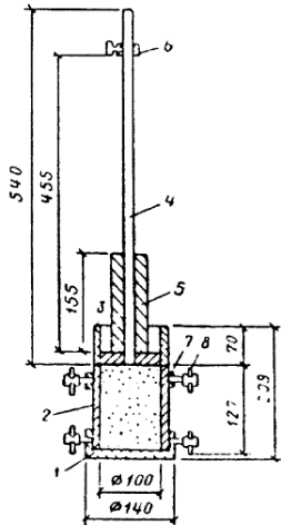 Рис. 41. Схема прибора Союздорнии для стандартного уплотнения грунтов 1 -подстаканник; 2 -разъемный цилиндр; 3 -верхний стакан; 4 -стойка с уплотнителем; 5 -груз; 6 -ограничительное кольцо; 7 -зажимное кольцо; 8 -зажимной винт