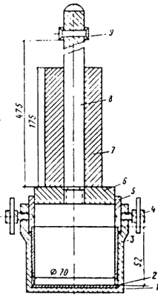Рис. 42. Схема прибора ЦНИИС для стандартного уплотнения грунта 1 -подстаканник; 2 -металлическая пластина; 3 -кольцо; 4 -зажим; 5 -насадка; 6 -штамп; 7 -гиря; 8 -стержень; 9 -ограничительное кольцо Опыты по уплотнению выполняют в следующем порядке. Вначале берут образец грунта в воздушно-сухом состоянии, размельчают и просеивают через сито с отверстиями 5 мм (для прибора Союздорнии) или 2 мм (для прибора ЦНИИС). Грунт, прошедший через сито, увлажняют до требуемой влажности, перемешивают, закладывают в цилиндр или кольцо прибора и уплотняют. При использовании прибора Союздорнии уплотнение выполняют последовательно в три слоя. Каждый из слоев уплотняют ударами груза носим 2,5 кг падающего с высоты 300 мм. Количество ударов назначают в зависимости от вида грунта (см. табл. 41). При использовании прибора ЦННИС ударами падающего груза уплотняют одновременно весь образец грунта, укладываемого в кольцо и насадку пятью слоями, с уплотнением каждого из слоев вручную пестиком. Объемный вес уплотненного грунта g определяют по формуле