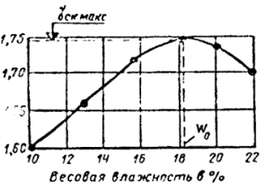 где g, W -соответственно объемный вес в г/см3 и весовая влажность в % уплотненного грунта. По полученным данным строят кривую стандартного уплотнения (рис. 43), а по ней определяют максимальную плотность и соответствующую ей оптимальную влажность.