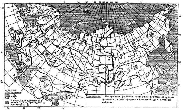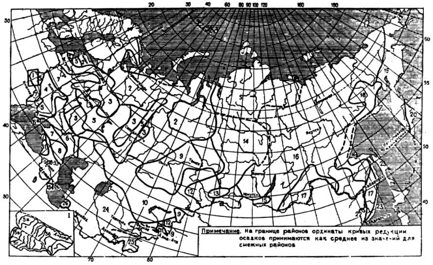 ПРИЛОЖЕНИЕ 22 (РЕКОМЕНДУЕМОЕ)СХЕМА РАЙОНОВ ТИПОВЫХ КРИВЫХ РЕДУКЦИИ ОСАДКОВ НА ТЕРРИТОРИИ СССР