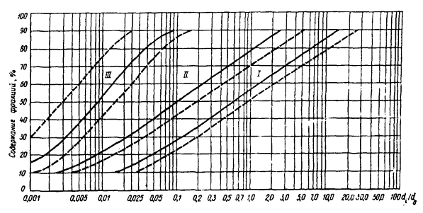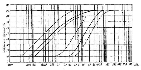 2. Для неоднородных плотин с ядром, намываемых из песчано-гравийного грунта, содержащего пылеватые и глинистые фракции (см. черт. 3, в разд. 3), расчет границ зон фракционирования выполняют по формулам: