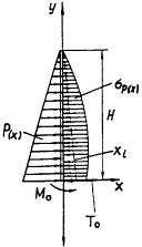 Р(х) - расчетная нагрузка на диафрагму; dр(х) - реактивные напряжения в грунте низовой призмы; Мо, То - реактивные соответственно момент и сила трения, действующие в опоре диафрагмы; хi - смещения диафрагмы; Н - высота диафрагмы