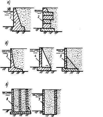Настоящие строительные нормы и правила распространяются на проектирование вновь строящихся и реконструируемых гидротехнических сооружений: подпорных стен, судоходных шлюзов, рыбопропускных и рыбозащитных сооружений. Проектирование сооружений, предназначенных для строительства на приморских окончаниях внутренних водных путей, следует осуществлять с учетом требований, отражающих специфические условия моря, в том числе гидрологический режим и агрессивность морской воды. В проектах сооружений, предназначенных для строительства в сейсмических районах, в районах распространения вечномерзлых, просадочных, набухающих грунтов, в условиях образования карста, оползней и селей, должны соблюдаться дополнительные требования, предъявляемые к таким сооружениям соответствующими нормативными документами, утвержденными или согласованными Госстроем СССР. При проектировании подпорных стен, судоходных шлюзов, рыбопропускных и рыбозащитных сооружений необходимо учитывать эксплуатационные требования, установленные для объектов народного хозяйства, в состав которых входят данные сооружения. При намечаемой реконструкции сооружений надлежит оценивать соответствие их современным техническим требованиям, техническое состояние отдельных конструкций и сооружений в целом, показатели их надежности, качество материалов с установлением их нормативных характеристик, надежность оснований, резервы несущей способности конструкций и оснований. Основные буквенные обозначения и индексы к ним, принятые в настоящих нормах согласно СТ СЭВ 1565-79, приведены в справочном приложении 1. 1. ОБЩИЕ ПОЛОЖЕНИЯ1.1. Выбор вида и конструкции подпорных стен, судоходных шлюзов, рыбопропускных и рыбозащитных сооружений надлежит производить на основании технико-экономического сравнения вариантов, а для сооружений, входящих в состав гидроузла, - с учетом конструктивных решений и методов производства работ, принятых для основных сооружений гидроузла. 1.2. Классы сооружений следует устанавливать в соответствии со СНиП 2.06.01-86. 1.3. При проектировании подпорных стен и судоходных шлюзов I и II классов, как правило, следует проводить прочностные, гидравлические и другие исследования. Проведение этих исследований для сооружений III и IV классов должно быть обосновано. Проектирование рыбопропускных и рыбозащитных сооружений независимо от их класса должно выполняться на основании ихтиологических изысканий и экологических исследований. 1.4. В сооружениях I, II и III классов следует предусматривать установку контрольно-измерительной аппаратуры (КИА), обеспечивающей проведение натурных наблюдений и исследований как в период строительства, так и в период эксплуатации. Состав, объем и режимы натурных наблюдений должны определяться программой, включаемой в проект. В сооружениях IV класса необходимость установки КИА должна быть обоснована. 1.5. Требования к материалам конструкций подпорных стен, судоходных шлюзов, рыбопропускных и рыбозащитных сооружений следует устанавливать в соответствии со СНиП 2.06.08-87 и СНиП II-23-81. 2. ПОДПОРНЫЕ СТЕНЫ2.1. В зависимости от конструкции и назначения гидротехнические подпорные стены подразделяются на следующие виды: гравитационные - возводимые на нескальном и скальном основаниях (черт.1), выполняемые обычно из монолитного или сборного бет