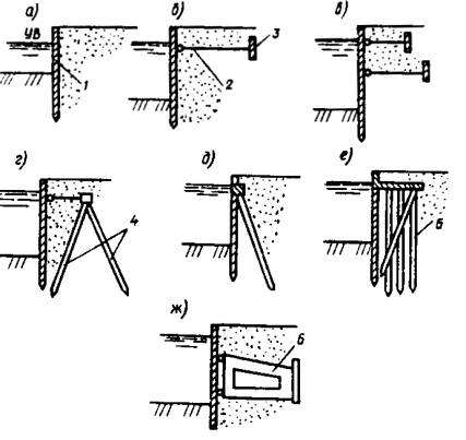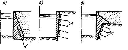 При соответствующем технико-экономическом обосновании подпорные стены допускается выполнять из дерева (ряжевые, шпунтовые, свайные); заанкеренные в скалу (черт. 3). Черт. 1. Основные виды гравитационных подпорных стен а - массивные; б - уголковые; в - ячеистые; 1 - монолитные; 2 - из сборных элементов; 3 - консольные; 4 - контрфорсные; 5 - с анкерными тягами; 6 - возводимые в котловане или наплавные; 7 - из оболочек большого диаметра Черт. 2. Основные виды шпунтовых и свайных подпорных стен а - безанкерные; б, в, г - заанкеренные одной или двумя тягами к плитам и сваям; д - заанкеренные к наклонным сваям; е - свайный ростверк с передним шпунтом; ж - заанкеренные с жестким (в том числе скользящим) анкерным устройством; 1 - шпунт; 2 - анкерная тяга; 3 - анкерная плита; 4 - анкерные сваи; 5 - свайный фундамент; 6- жесткий анкер Черт. 3. Подпорные стены, заанкеренные в скалу а - массивные; б - заанкеренные облицовки; в - комбинированные с массивной облицовкой; 1 - скальный анкер 2.2. При проектировании подпорных стен следует рассматривать целесообразность использования пригрузки на поверхность обратной засыпки и нагрузок строительного периода для уплотнения засыпки и основания, упора в соседнее сооружение, конструкции стен с обратным уклоном основания, подсыпки из крупнозернистого грунта для уменьшения высоты стен, разгрузочных и экранирующих устройств (каменные призмы, свайные экраны и др.), различных способов укрепления грунта основания или его частичной замены, дополнительных конструктивных элементов, повышающих устойчивость (анкеровка в обратную засыпку, устройство зубьев, упоров, армирование грунта обратной засыпки и т. п.). 2.3. Обратную засыпку за стенами со стороны тыловой грани следует, как правило, выполнять из несвязных водопроницаемых грунтов, обеспечивающих хороший отвод поверхностных, грунтовых и фильтрационных вод, быстропротекающую деформацию засыпки и наименьшую ее осадку, а также исключающих в ней морозное пучение. Эти требования должны выполняться во всех случаях засыпок при узком фронте работ. При выполнении обратной засыпки из глинистых грунтов следует принимать меры по понижению уровня и отводу грунтовых вод, по недопущению морозного пучения (укладка у тыловой грани стены слоя непучинистого грунта толщиной до 1 м и др.), а также учитывать ползучесть грунта. При проектировании сооружений, поддерживающих оползневые склоны, для обратной засыпки у тыловой грани следует использовать крупнозернистые проницаемые грунты, обеспечивающие отвод фильтрующейся воды. 2.4. За расчетное значение плотности сухого грунта засыпки следует принимать величину rd, соответствующую односторонней доверительной вероятности а = 0,95. Исходя из этого устанавливаются контрольные показатели физико-механических характеристик грунта для сооружения. Обеспеченность плотности укладки грунта засыпки следует принимать для сооружений I и II класса - 90 %; для сооружений III и IV класса - 70 %. Снижение требований к плотности грунта засыпки в каждом отдельном случае должно быть обосновано. Засыпку по высоте стены следует, как правило, выполнять одинаковой плотности. При расположении на засыпке сооружений и механизмов плотность грунта засыпки следует назначать по допустимым осадкам, устанавливаемым технологическими требованиями эксплуатации этих сооружений или механизмов. 2.5.