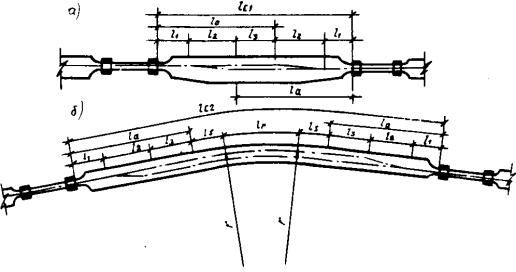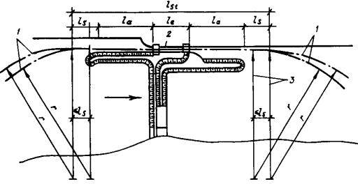где l1, l2, l3 - длины участков, определяемые согласно требованиям обязательного приложения 5. При размещении двух шлюзов на криволинейном участке канала (черт. 2, б) расстояние между ними должно быть не менее величины lc2, определяемой по формуле