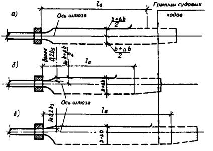 Черт. 1. Схема подходных каналов к шлюзу а - симметричный; б - полусимметричный; в - несимметричный полусимметричные (черт. 1, б) - ось подходного канала смешена относительно оси шлюза в сторону от причальной линии таким образом, что расстояние между лицевой гранью устоев головы шлюза и причальной линией находится в пределах от 0,2 расчетной ширины судна до расстояния, соответствующего симметричному подходу; несимметричные (черт. 1, в) - ось подходного канала расположена по отношению к оси шлюза так, что причальная линия продолжает лицевую грань устоев головы шлюза или смещена от нее на расстояние не более 0,2 расчетной ширины судна. 3. Ширину судового хода подходных участков с прямолинейным движением на уровне расчетной осадки при наинизшем расчетном судоходном уровне следует принимать не менее величины b, определяемой по следующим формулам: для однониточных шлюзов b = 1,3(bs1 + bs2); (1) для двухниточных шлюзов b = 1,3(bs1 +bs2 + bs3), (2) где bs1,bs2,bs3 - ширины расходящихся расчетных судов. Ширину судового хода подходных участков двухниточных шлюзов следует принимать не менее расстояния между лицевыми гранями внешних стен камер смежных шлюзов. В подходном канале двухниточного шлюза при размещении причальной линии на продолжении межкамерного пространства ширина судового хода к каждой нитке определяется как для однониточного шлюза из условия обеспечения расхождения двух судов. 4. Расчетная глубина судового хода подходных каналов при расчетном наинизшем судоходном уровне должна приниматься не менее 1,3 статической осадки расчетного судна в полном грузу. При надлежащем обосновании допускается учитывать дополнительно запас на заносимость подходов. 5. Длина верхнего (нижнего) участка подхода (черт. 2), в пределах которого предусматривается расхождение встречных судов, должна быть не менее величины la, определяемой по формуле la = l1+l2+l3, (3) где l1 - длина участка, равная 0,5 ls; l3 - длина участка, равная l2 - длина участка, на котором судно при встречном движении переходит с оси шлюза на ось судового хода в канале, определяемая по формуле