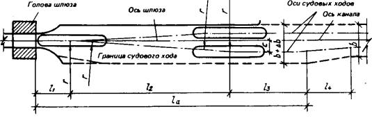 где ls, - длина расчетного судна; lr, - длина криволинейной вставки, очерченной радиусом г. Черт. 2. Схема размещения последовательно располагаемых шлюзов на судоходном канале а - на прямолинейном участке; б - на криволинейном участке канала 11. В местах расположения на подходах к шлюзам сосредоточенных заборов или выпусков воды из других гидротехнических сооружении должно быть предусмотрено уширение подходов, которое назначается в зависимости от величины дрейфа, испытываемого судном под влиянием поперечного течения, скорости которого при наинизшем судоходном уровне не должны превышать 0,25 м/с. Сопряжение уширенного и нормального сечений канала выполняется плавно на длине не менее 20 уширений в каждую сторону от границ водосбросных (водозаборных) сооружений. ПРИЛОЖЕНИЕ 5Обязательное ТРЕБОВАНИЯ К ГАБАРИТАМ И КОМПОНОВКЕ ПОДХОДОВ К ШЛЮЗАМ1. Размеры и очертания подходов к шлюзам в плане должны обеспечивать расхождение шлюзуемых судов при двустороннем движении. На период временной эксплуатации шлюза при строительстве гидроузла допускается устройство подходов для одностороннего движения с разъездами или без них при условии обеспечения необходимой пропускной способности. 2. Подходы к шлюзам по взаимному расположению их оси и продольной оси шлюза подразделяют на следующие: симметричные (черт. 1,а) - оси подходного канала и шлюза совпадают;