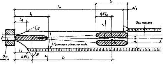 Чертеж. Схема подходного канала к шлюзу для определения длины причальной линии 4. Длину причальной линии шлюзов lm (см. чертеж) следует определять при одностороннем движении судов в каждом из направлений по формуле