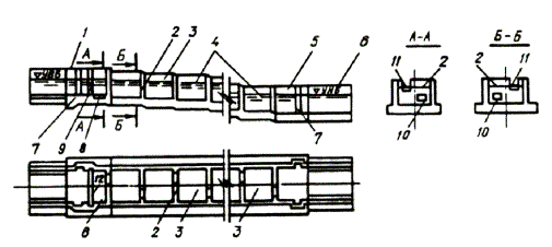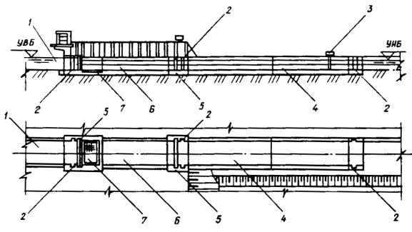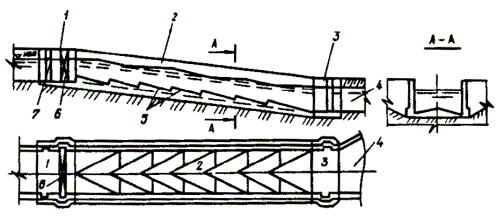 Черт. 1. Рыбоходные сооружения. Лотковый рыбоход 1 - верхняя голова; 2 - тракт; 3 - входной оголовок; 4 - подходной участок; 5 - устройство для гашения скорости воды в тракте; 6 - устройство для регулирования расхода; 7 - пазы ремонтных заграждений