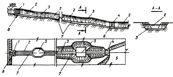Черт. 2. Рыбоходные сооружения. Прудковый рыбоход 1 - верхняя голова; 2 - камеры тракта; 3 - прудки для отдыха рыб; 4 - входной оголовок; 5 - подходной участок; 6 - пазы ремонтных заграждений; 7 - тракт; 8 - устройство для регулирования расхода