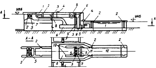 Черт. 5. Рыбоподъемные сооружения. Гидравлический рыбоподъемник 1 - верховой (выходной) лоток; 2 - аварийно-ремонтные заграждения; 3 - сетчатые затворы; 4 - побудительное устройство; 5 - затворы эксплуатационные и блоков питания; 6 - блок питания; 7 - выплывные отверстия; 8 - ихтиологическое устройство; 9 - подъемная площадка; 10 - обходные галереи; 11 - стационарные рыбозащитные решетки; 12 - рыбонакопитель