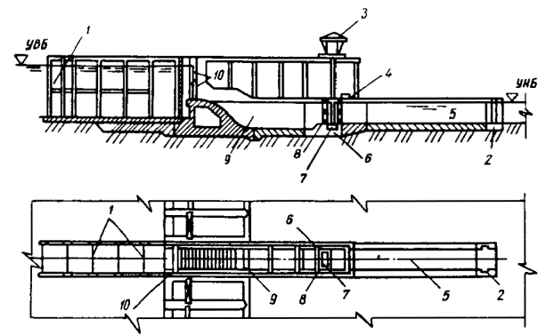 Черт.6. Рыбоподъемные сооружения. Механический рыбоподъемник 1 - верховой выходной лоток; 2 - аварийно-ремонтные заграждения; 3 - кран; 4 - побудительное устройство; 5 - рыбонакопитель; 6 - рабочая камера; 7 - ниша контейнера с подъемной площадкой; 8 - сетчатые затворы; 9 - блок питания; 10 - затвор блока питания РЫБОЗАЩИТНЫЕ СООРУЖЕНИЯ