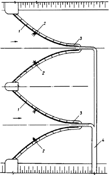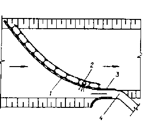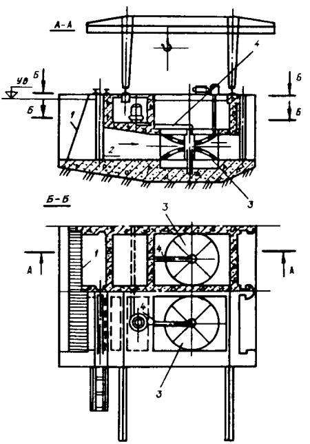 Черт. 9. Конический двухполосный рыбозаградитель с рыбоотводом 1 - сороудерживающая решетка; 2 - камера; 3 - заградитель; 4 - труба рыбоотвода