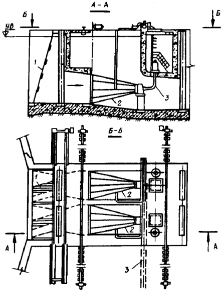 Черт. 10. Конический однополосный рыбозаградитель с рыбоотводом (конусный) 1 - сороудерживающая решетка; 2 - заградитель; 3 - рыбоотвод