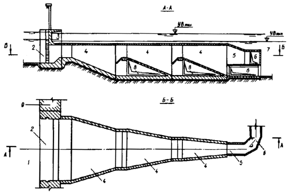 Черт. 4. Рыбоподъемные сооружения. Рыбопропускной шлюз 1 - верховой (выходной) лоток; 2 - аварийно-ремонтные заграждения; 3 - побудительное устройство; 4 - рыбонакопитель; 5 - затворы эксплуатационные с блоком питания; 6 - рабочая камера; 7 - ихтиологическое устройство