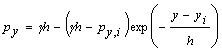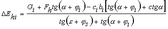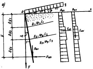 здесь Gi - сумма вертикальных составляющих нагрузок, включая вес элемента, нагрузки на его поверхности и др.; Fh - сумма горизонтальных составляющих нагрузок в пределах ширины элемента bi , в том числе фильтрационные силы (со знаком "плюс" - при направлении в сторону расчетной плоскости); bi - ширина элемента; ji - угол внутреннего трения у основания элемента; сi - средневзвешенное значение удельного сцепления по высоте элемента; a - угол между вертикалью и поверхностью обрушения, принимается со знаком "плюс" - по направлению часовой стрелки; js - средневзвешенное значение угла трения по расчетной плоскости. Если вычисленное значение Eah < 0, то следует принимать Еah = 0. Если сила Еan < 0, то она направлена вверх. Для определения интенсивности давления рah и точки приложения сил Еah и Еan принимают допущение, что давление на любую часть стены высотой у < Н можно определить тем же способом, что и для всей стены. Вследствие этого выбирают на расчетной плоскости несколько характерных точек на глубинах уj и для каждой определяют указанным выше способом давление Еahj, а затем вычисляют среднюю интенсивность давления на участке (yj - yj-1) по формулам: