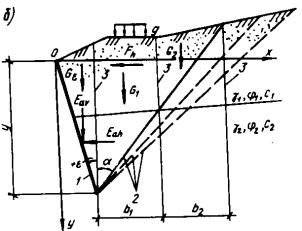 При определении горизонтальной Еah и вертикальной Ean составляющих давления грунта суммирование эпюр интенсивности давления производится по высоте. Если расчетная плоскость проходит в грунте, то следует определять давление при нескольких возможных ее положениях (нескольких углах e), приняв за расчетное наивыгоднейшее для рассматриваемого предельного состояния. В однородном грунте на участке, где e > (45° - j/2) (пологая стена) расчетную плоскость допускается принимать под углом e = (45° - j/2). Черт. 1. Схемы к расчету активного давления грунта а - в простых случаях; б - сложных случаях; 1 - расчетная плоскость; 2 - возможные поверхности обрушения; 3 - вертикальные плоскости раздела между элементами призмы обрушения 2. В общем случае горизонтальную Еah и вертикальную Еаn составляющие активного давления грунта на расчетную плоскость (черт. 1, б) допускается определять, намечая возможные поверхности обрушения 2 от низа расчетной плоскости 1. При больших неравномерных нагрузках на поверхности грунта и слоях, резко отличающихся по характеристикам, поверхности обрушения могут быть неплоскими. Следует также рассматривать поверхности, частично или полностью проходящие по поверхности котлована или слабым прослойкам. Для каждой поверхности обрушения определяют значение горизонтальной Еаh составляющей бокового давления грунта. Наибольшее значение Еah будет искомой горизонтальной составляющей активного давления, а соответствующая этой величине поверхность обрушения - расчетной. Для определения Еah призму обрушения разделяют вертикальными плоскостями 3 на отдельные элементы таким образом, чтобы в основании каждого был однородный грунт и основание можно было считать плоским. При e > 0 элемент между расчетной плоскостью и вертикалью, проведенной через ее низ, как самостоятельный элемент не рассматривается: в зависимости от того, что может дать большее значение Еah, вес этого элемента Ge, присоединяется к ближайшему или распределяется между остальными, например, пропорционально их весам Gi). Горизонтальная Еah и вертикальная Еаn составляющие бокового давления грунта определяют по формулам: