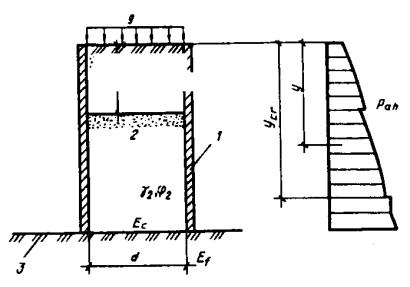 здесь n - коэффициент поперечной деформации грунта, принимаемый при отсутствии опытных данных по СНиП 2.02.02.85. 4. В общем случае давление грунта на жесткую подпорную стену допускается определять как активное, принимая удельное сцепление грунта равным нулю и условное значение угла внутреннего трения по формуле Давление грунта на внутренние стены ячеек (оболочек) (черт. 2) Черт. 2. Схема к расчету давления грунта на внутренние стены ячеек (оболочек) 1 - ячейка; 2 - грунт засыпки; 3 - грунт основания 5. При равномерно распределенной нагрузке q на уровне верха ячейки горизонтальная и вертикальная составляющие интенсивности давления грунта на глубине у определяются по формулам: