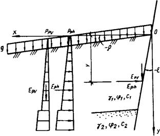 где ру - вертикальное давление на глубине у: здесь g - удельный вес грунта внутри ячейки на глубине у; уi - высота i-го слоя грунта над поверхностью слоя, в пределах которого определяется рah; ру,i - вертикальное давление на поверхности слоя, в пределах которого определяется рah (для верхнего первого слоя при у £ у1 ру,i = q; для второго при у >уi вычисляется по формуле (17), принимая y = y1 и py,i= q и т. д); А и u - соответственно площадь и периметр ячейки (для квадратных и круглых ячеек A/u = d/4, для параллельных стен А/и = d/2 (d - расстояние между стенами ячейки или диаметр круглой ячейки); lah - коэффициент горизонтальной составляющей давления грунта, определяемый по формуле (4). Для жестких, не расширяющихся в горизонтальном направлении ячеек расчет ведется на условное значение угла внутреннего трения, определенное по формуле (14). Угол трения js допускается принимать постоянным в пределах высоты слоя грунта: при Ef ³4Ec или при наличии у ячейки днища js = 2/3j, при Еf < Еc js = 2/3j, если у £ уcr, и js = -1/3j, если у > уcr; Еf и Еc - соответственно модули деформации грунта основания и внутри ячейки; ycr - глубина, на которой осадка грунта внутри ячейки равна осадке ячейки, т. е. отсутствует вертикальное смещение грунта относительно расчетной поверхности (как правило, уcr определяется путем последовательных приближений). Пассивное давление (черт. 3) Черт. 3. Схема к расчету пассивного давления грунта 6. При плоской поверхности грунта, равномерно распределенной нагрузке q на поверхности грунта и слоях грунта, параллельных поверхности, горизонтальная рph и вертикальная рpv составляющие пассивного давления грунта на единицу высоты расчетной плоскости определяются по формулам:
