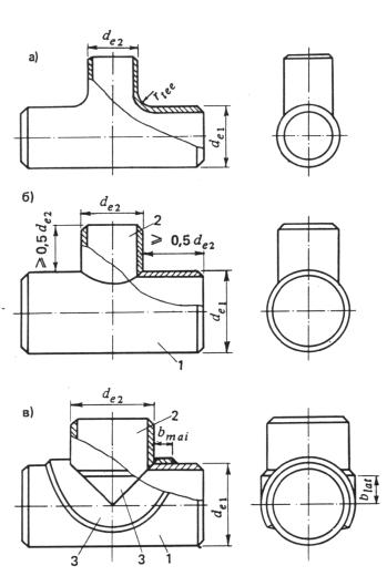 Значения коэффициентов несущей способности, определяемые согласно п. 4.6, следует учитывать в расчетах для следующих решений соединительных деталей. 1. Равнопроходные и переходные тройниковые соединения (тройники): бесшовные, получаемые выдавливанием или экструзией ответвления в горячем состоянии, и штампосварные, получаемые сваркой по образующим двух несимметричных частей, одна из которых имеет цельноштампованное ответвление (черт. 1, а). Радиус rtee должен быть не менее толщины стенки тройника; сварные, получаемые путем врезки одной трубы (или трубной обечайки) в другую под прямым углом (черт. 1, б), и тройники сварные, усиленные накладками (черт. 1, в), которые целесообразно применять при d ³ 300 мм. При этом для тройников с отношением диаметров ответвления к магистрали de2/de1< 0,2 накладки не ставятся, а при de2/de1< 0,5 накладка ставится только на магистрали. Ширина накладок (черт. 1, в) должна быть на магистральной части тройника bmai= 0,4de1, на ответвлении - blat= О.Зdez. Толщина накладок должна быть равна толщине стенки магистральной части тройника. Черт. 1. Тройники а - бесшовный и штампосварной; б - сварной без усиливающих элементов; в - сварной, усиленный накладками; 1-магистральная часть тройника; 2 -ответвление; 3 - накладка