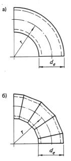 4. Отводы: бесшовные, получаемые путем горячей протяжки трубных заготовок, и отводы штампосварные, получаемые сваркой из двух горячештампованных симметричных заготовок (черт. 4, а); сварные, которые должны иметь не менее трех секторов и двух полусекторов (черт. 4, б). Отводы изготовляются с обязательной подваркой корня шва изнутри. Длина секторов по внутренней образующей должна быть не менее 0,15de. Черт. 4. Отводы a - бесшовный и штампосварной; б - сварной