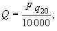 В формулах (34) и (35): F - водосборная площадь, м2; q20 - интенсивность дождя, л/с с 1 га (для данной местности), продолжительностью 20 мин при периоде однократного превышения расчетной интенсивности, равной 1 году (принимаемая согласно СНиП 2.04.03-85); q5 - интенсивность дождя, л/с с 1 га (для данной местности), продолжительностью 5 мин при периоде однократного превышения расчетной интенсивности, равной 1 году, определяемая по формуле