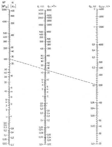 Черт. 3. Номограмма для определения секундных и часовых расходов воды q при q0 £ 0,3 л/с, N £ 200 и Р > 0,1