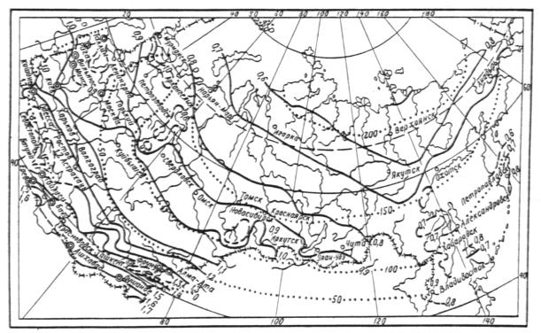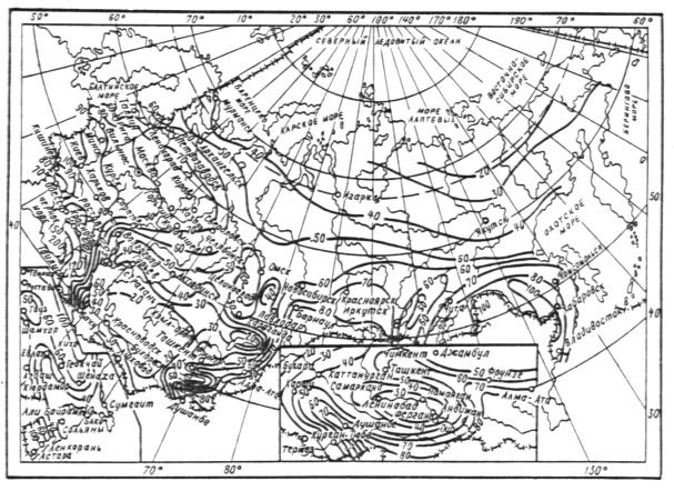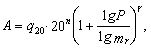 где q20 - интенсивность дождя, л/с на 1 га, для данной местности продолжительностью 20 мин при Р = 1 год, определяемая по черт. 1; п - показатель степени, определяемый по табл. 4; тr - средние количество дождей за год, принимаемое по табл. 4; Р - период однократного превышения расчетной интенсивности дождя, принимаемый по п. 2.13; g - показатель степени, принимаемый по табл. 4. Черт. 1. Значения величин интенсивности дождя q20 Таблица 4