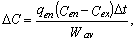 6.56. При необходимости усреднения расхода и концентрации сточных вод объем усреднителя и концентрацию загрязняющих веществ необходимо определять пошаговым расчетом. Приращения объема водной массы DW, м3, и концентрации DС, г/м3, на текущем шаге расчета следует определять по формулам: