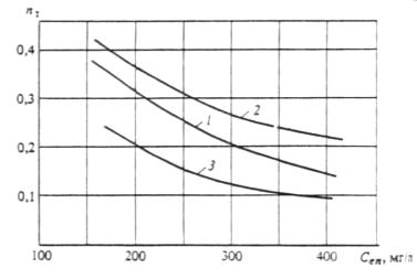 Черт. 2. Зависимость показателя степени n2 от исходной концентрации взвешенных веществ в городских сточных водах при эффекте отстаивания 1 - Э = 50 %; 2 - Э = 60 %; 3 - Э = 70 % 6.61. Основные расчетные параметры отстойников надлежит определять по табл. 31. Таблица 31