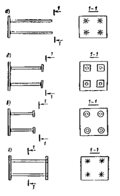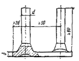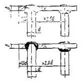 Примечания: 1. Размеры конструктивных элементов сварных соединений могут быть определены в соответствии с документами, указанными п. 5.15 настоящих Рекомендаций. 2. При использовании способов сварки поз. 1, 2, 4, 6-8 толщина пластины может быть уменьшена на 25 %, если с ее внешней стороны предусматривается приварка ребер жесткости или жесткой конструкции, по линии, соединяющей центры анкерных стержней, однако значение d/d должно быть не менее 0,3. 3. Соединение № 11 при d£14 мм применяется в случаях, когда не исключено воздействие на него случайных моментов. 4. В том случае, когда анкерные стержни