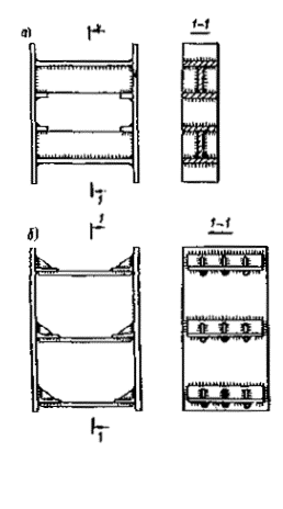где Qi - усилие в анкере. Формулой (41) можно пользоваться, если толщина анкерной пластины составляет не менее 0,2 ее длины. При наличии на концах анкеров усилений в виде поперечных коротышей (см. п. 5.8) бетон под ними проверяют на смятие из условия где j - см. п. 4.1 настоящих Рекомендаций; Асb - площадь поперечного сечения коротыша; Rs - характеристика, относящаяся к коротышу; j сb - коэффициент, равный: а) для симметричного поперечного коротыша, приваренного к одному анкерному стержню (рис. 15, а),