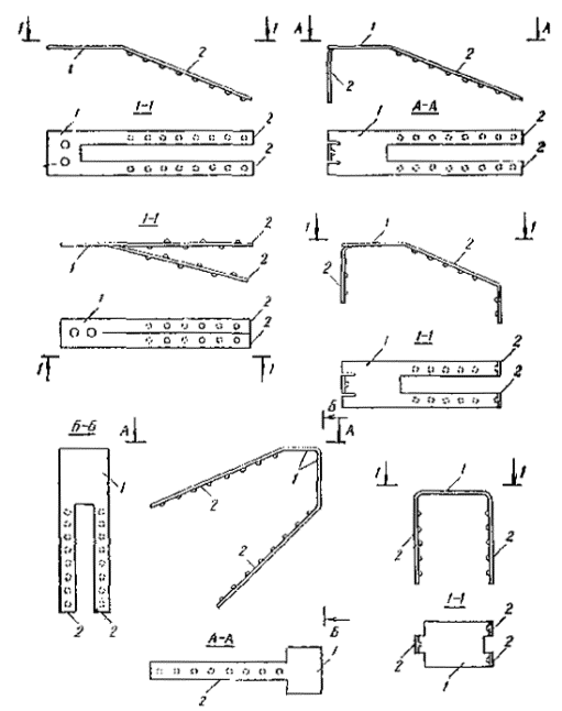 Примечание. sbc - сжимающие напряжения в бетоне, действующие перпендикулярно анкерному стержню и определяемые как для упругого материала по приведенному сечению от постоянно действующих нагрузок при коэффициенте надежности по нагрузке, равном 1. где Nan1 и Qan1 - соответственно растягивающее и сдвигающее усилия в анкерном стержне. Примечание. Для наклонных анкеров рекомендуется принимать jс = 1 Для нормального анкера длину lап отсчитывают от внутренней поверхности пластины, а для наклонного - от начала отгиба. В том случае, когда анкерные стержни установлены с запасом по площади сечения по сравнению с требуемой по расчету по прочности, при определении lan по формуле (62) значения Rs умножают на величину, равную отношению расчетного и фактического значений площади сечений анкерных стержней. Рис. 21. Конструкция закладной детали с упорами для восприятия сдвигающей силы 1 - нормальные анкеры; 2 - упор из арматурного коротыша; 3 - упор из полосовой стали; 4 - упор из стальной пластины, работающий в двух направлениях В элементах из мелкозернистого бетона вида Б значения 1ап, определяемые по формуле (62), следует увеличить на 10 и 5d соответственно для растянутой и сжатой зон. 5.8. Длина анкеров закладных деталей при действии на них растягивающих сил (см. п. 5.7 настоящих Рекомендаций) может быть уменьшена при условии усиления концов анкерных стержней анкерными головками диаметром не менее 2d, высаженными горячим способом, а также приваркой анкерных пластин или поперечных коротышей. В этих случаях длина анкерного стержня определяется по расчету на выкалывание и смятие (см. пп. 4.7, 4.8, 4.10 и 4.12) и принимается при усилениях в виде головок и пластин не менее 10d и при усилении коротышами - не менее 15d. В том случае, если в бетоне возможно образование трещин вдоль анкеров (sbt > Rbt) в пределах их расчетной длины, необходимо либо устройство высаженных головок, либо припарка анкерных пластин. Растягивающее напряжение в бетоне sbt определяется как для упругого тела. 5.9. Расчетные анкеры из гладкой арматуры класса А-I следует применять только при наличии усилений на их концах в виде пластинок, высаженных головок и поперечных коротышей. Длина этих анкеров определяется по расчету на выкалывание и смятие бетона (см. пп. 4.7, 4.8 и 4.10-4.12). Для конструктивных деталей допускается применение анкеров из той же стали с устройством на их концах крюков. 5.10. Закладные детали в бетонах на пористых заполнителях проектных классов В5-В10 рекомендуется проектировать таким образом, чтобы отрывающие силы воспринимались нормальными анкерами, а сдвигающие - наклонными. Анкеры закладных деталей в этих случаях рекомендуется принимать из арматурной стали периодического профиля класса А-II или из гладкой арматурной стали класса А-I диаметром не более 16 мм. На концах анкеров следует предусматривать усиления в виде высаженных головок, а также в виде приваренных пластин или поперечных коротышей. Длина анкерных стержней и размеры усиления определяются по расчету на выкалывание и смятие бетона (см. пп. 4.7, 4.8, 4.10-4.12). При этом длину анкера принимают не менее 15d, а диаметр высаженной головки - не менее 3d. Штампованные закладные детали рекомендуется проектировать таким образом, чтобы направление основного внешнего усилия совпадало с поправлением анкерующих частей или составляло с этим направлением угол не бол