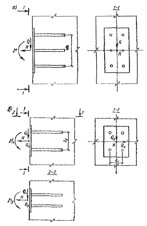 z - расстояние между крайними рядами анкеров; паn - число рядов анкеров вдоль направления сдвигающей силы. Если не обеспечивается равномерная передача сдвигающей силы Q на все ряды анкеров, при определении сдвигающего усилия Qan учитывается не более четырех рядов; j - коэффициент, определяемый для анкерных стержней диаметром 8-25 мм (для тяжелого бетона классов В12,5 - В50 и легкого бетона классов В 12,5-В30) по формуле но принимаемый не более 0,7. Для бетона классов выше В50 коэффициент j принимается как для бетона класса В50. Для тяжелого (обычного) бетона коэффициент j можно определять по табл. 2. Рис. 5. Схема усилий, действующих на закладную деталь а - в одной плоскости симметрии; б - в двух плоскостях симметрии В формуле (5): Rb и Rs - в МПа; Aan1 - в см2; но принимаемый не менее 0,15. Коэффициент w принимается равным: